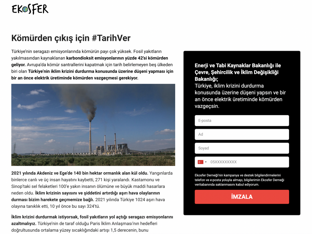 Ekosfer’in imza kampanyasını incelediğimizde, menü, rapor, video, farklı bir sayfaya bağlantı vs gibi insanların kampanyayı imzalamadan siteden ayrılmasına sebep olacak bir bağlantı göze çarpmıyor. Bu şekilde sitemize gelen insanlar, istediğimiz aksiyon olan imza vermek dışında farklı bir şey yapamıyor.
